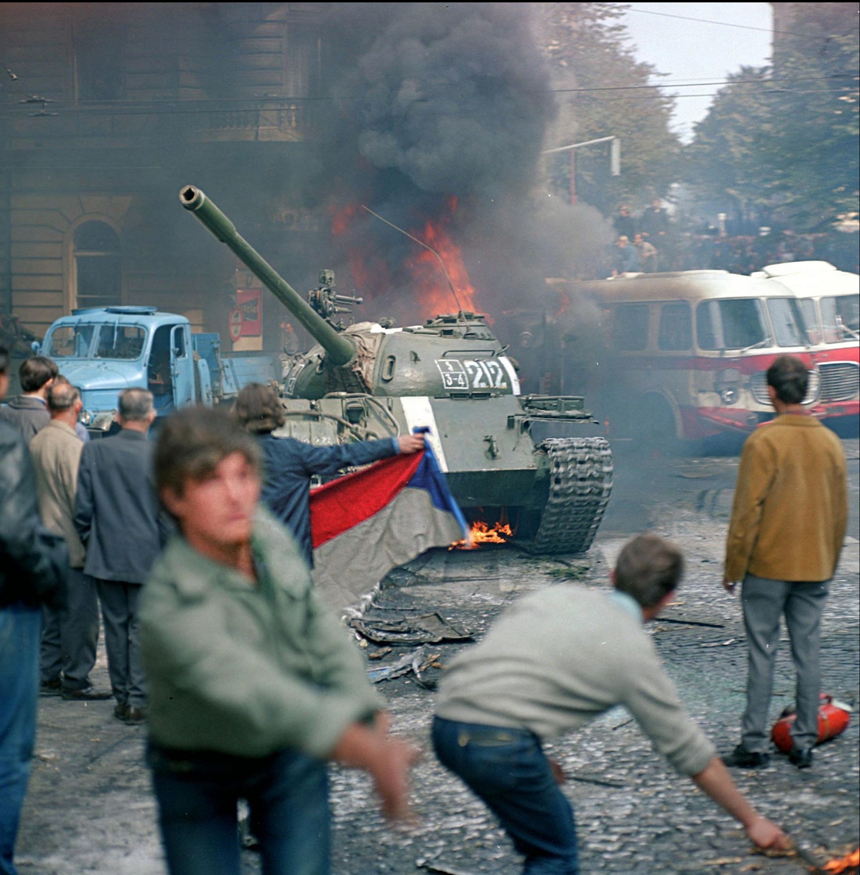 Подойдя к ЦК партии на Влтавской набережной, мы увидели двух парней, чеха и русского военного, которые пытались о чем-то договориться, — видимо, не очень успешно. Чех держал в руках окровавленный чехословацкий флаг, которым, как оказалось, рано утром был прикрыт труп одной из первых жертв оккупации. Парень отошел, и я заговорил с этим советским солдатом. До сих пор помню, что он мне сказал: «Зовут меня Сережа, я из-под Воронежа. В начале лета окончил двухлетнюю срочную службу в ГДР — и меня там сразу оставили еще на два года каких-то чрезвычайных учений. Сейчас больше месяца проторчал на чехословацкой границе в этой раскаленной запыленной жестянке, — показал на стоявший неподалеку бронетранспортер. — Ну, кому охота, как ты думаешь?» Это был совершенно нормальный советский молодой человек, но надо сказать, что другого такого я в оккупированной Чехословакии больше не встречал.