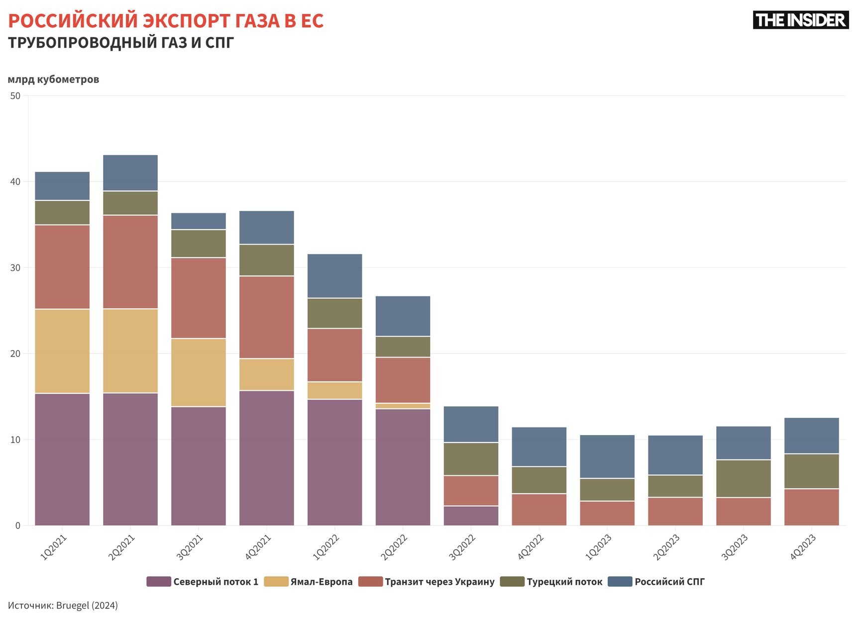 Транзит через Украину остается одним из двух действующих маршрутов доставки трубопроводного газа из России в Европу. До полномасштабной войны их было четыре: «Северный поток – 1» (основной газопровод из России в Европу; в 2021 году также было завершено строительство «Северного потока – 2»), «Ямал – Европа», «Турецкий поток» и через Украину. Помимо этого, Россия экспортировала сжиженный природный газ (СПГ), на него приходилось около 6% всего ее экспорта газа в Европу.