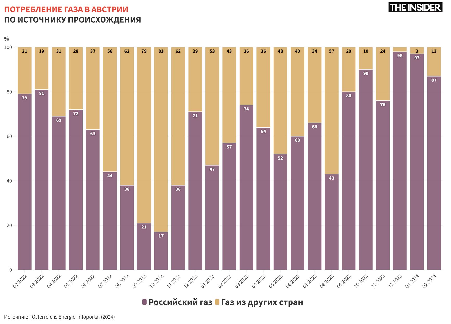 В Австрии находится Центральноевропейский газовый хаб (Баумгартен), оттуда российский газ распределяется дальше — в Венгрию, Италию и Словению. Примерно половину из импортируемого газа страна оставляет себе. У Австрии самая высокая зависимость от российского газа в Европе — в декабре 2023 года российский газ составил 98% потребления. Намного выше, чем в феврале 2022 года (78%), когда Россия начала свою войну в Украине.