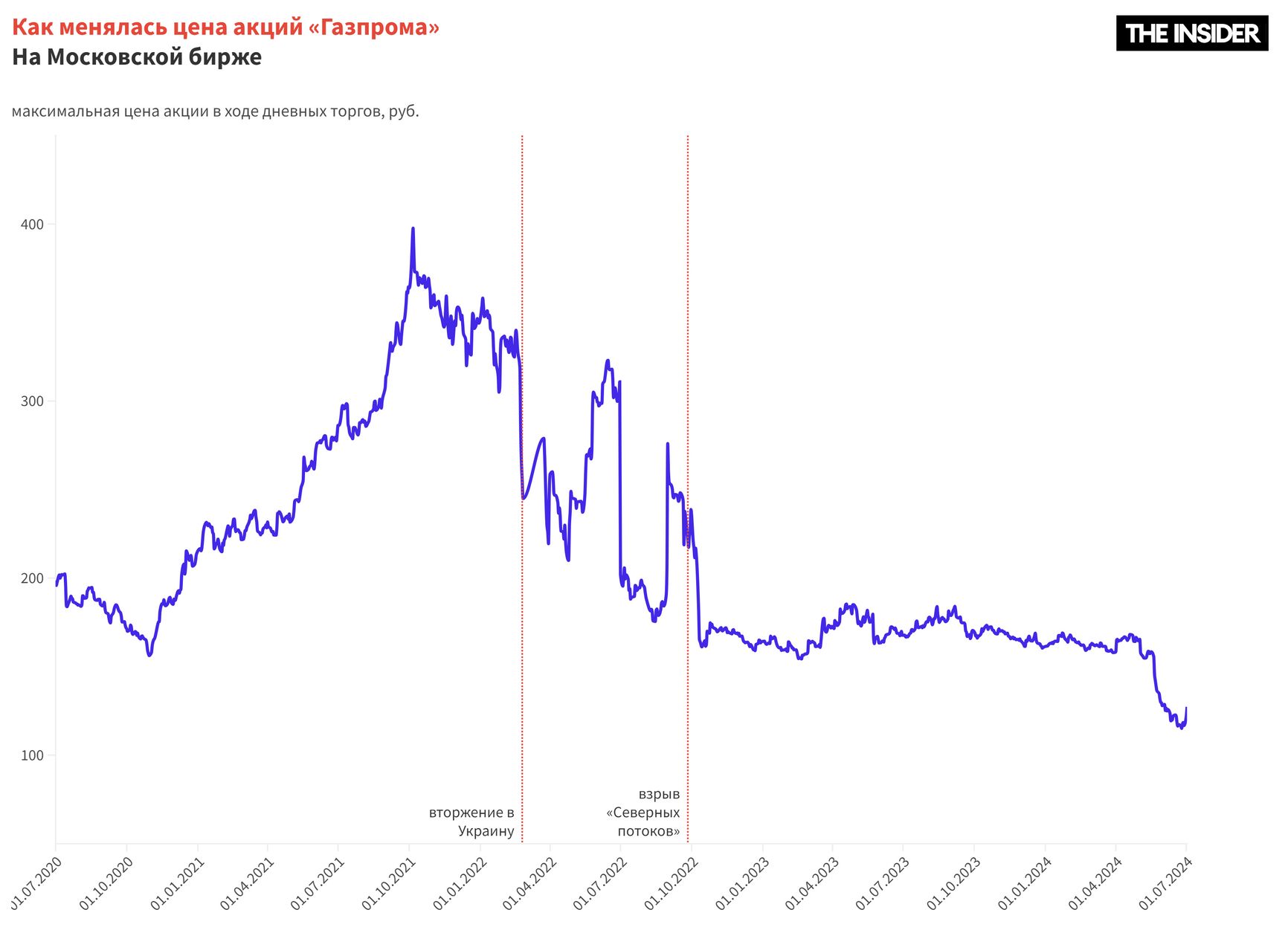 «Газпром» отказался от выплаты годовых дивидендов третий год подряд. Промежуточные дивиденды последний раз платили в 2022 году: за первое полугодие инвесторы получили рекордные 1,2 трлн рублей. Очередной отказ от дивидендов сказался на цене акций — только за последние пару месяцев они потеряли 30% цены. С довоенного пика — падение более чем втрое.