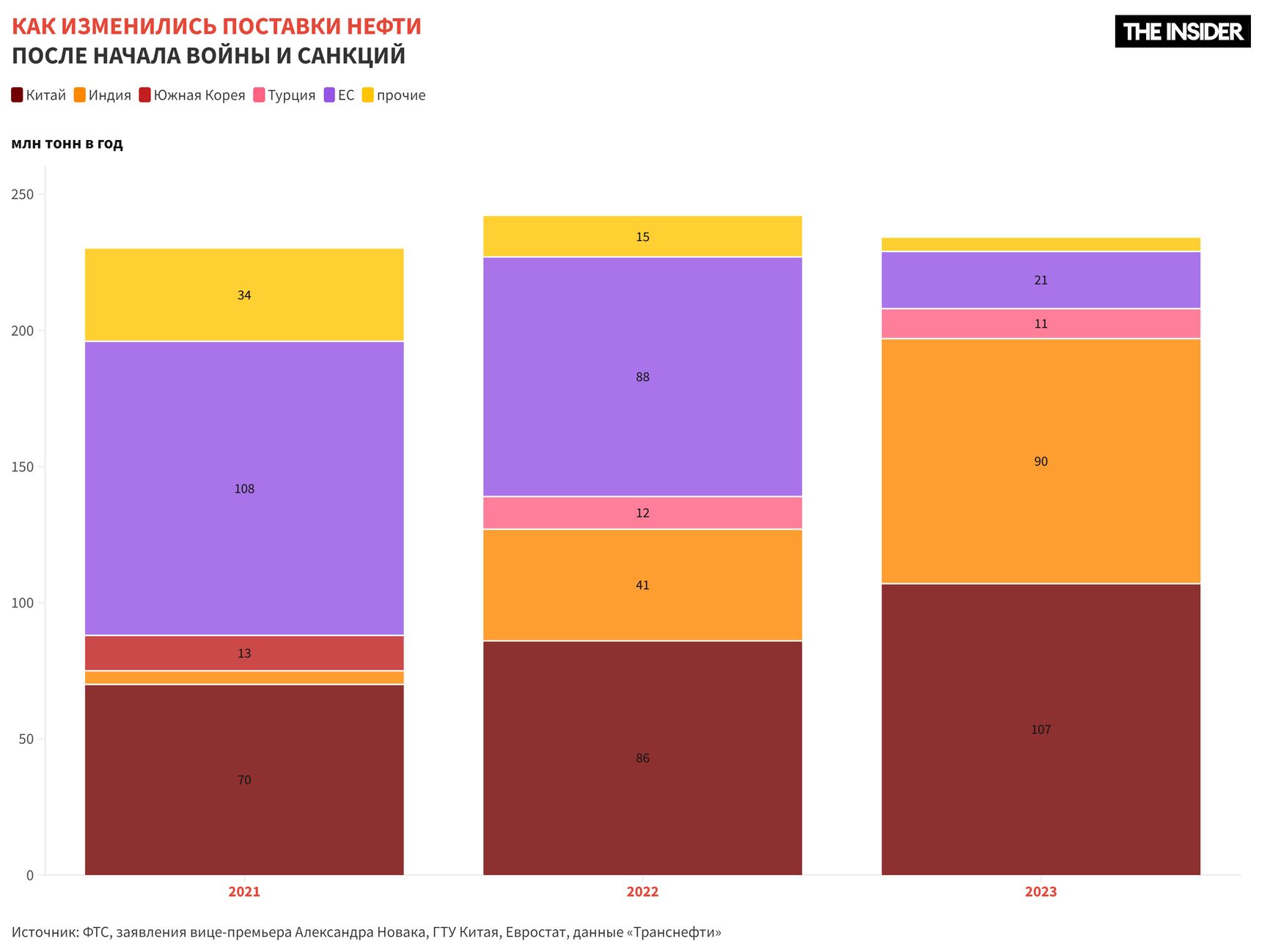 Этот разворот на Восток дался не бесплатно российским компаниям. Чтобы не потерять в объемах поставок, им пришлось уступить в цене, продавая нефть со скидкой. Из-за этого только при поставках в Китай компании недосчитались $5,3 млрд в 2022 году и $3,7 млрд — в январе–сентябре 2023 года, по данным Института Гайдара. С тех пор дисконт постепенно снижается, как утверждает Новак.