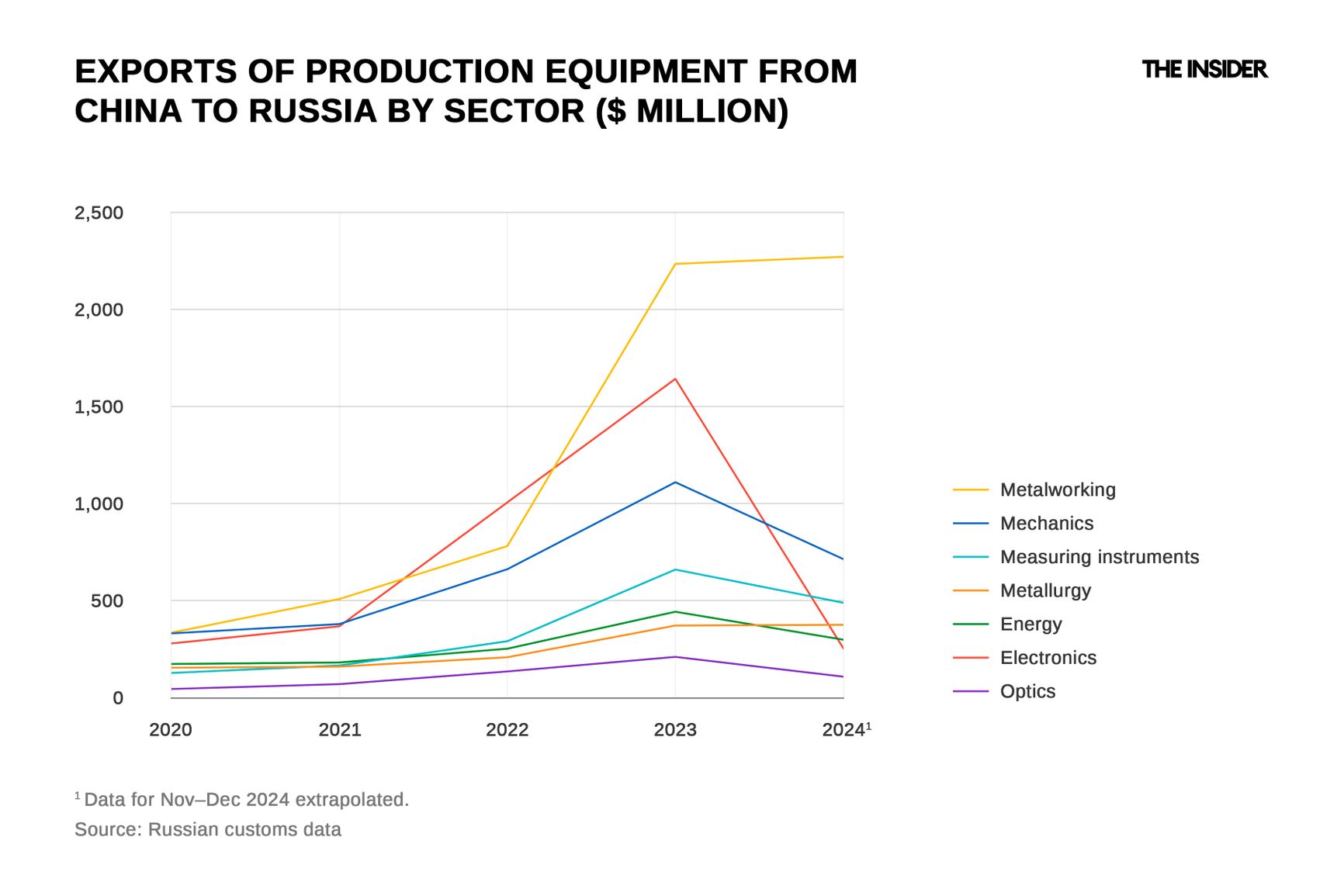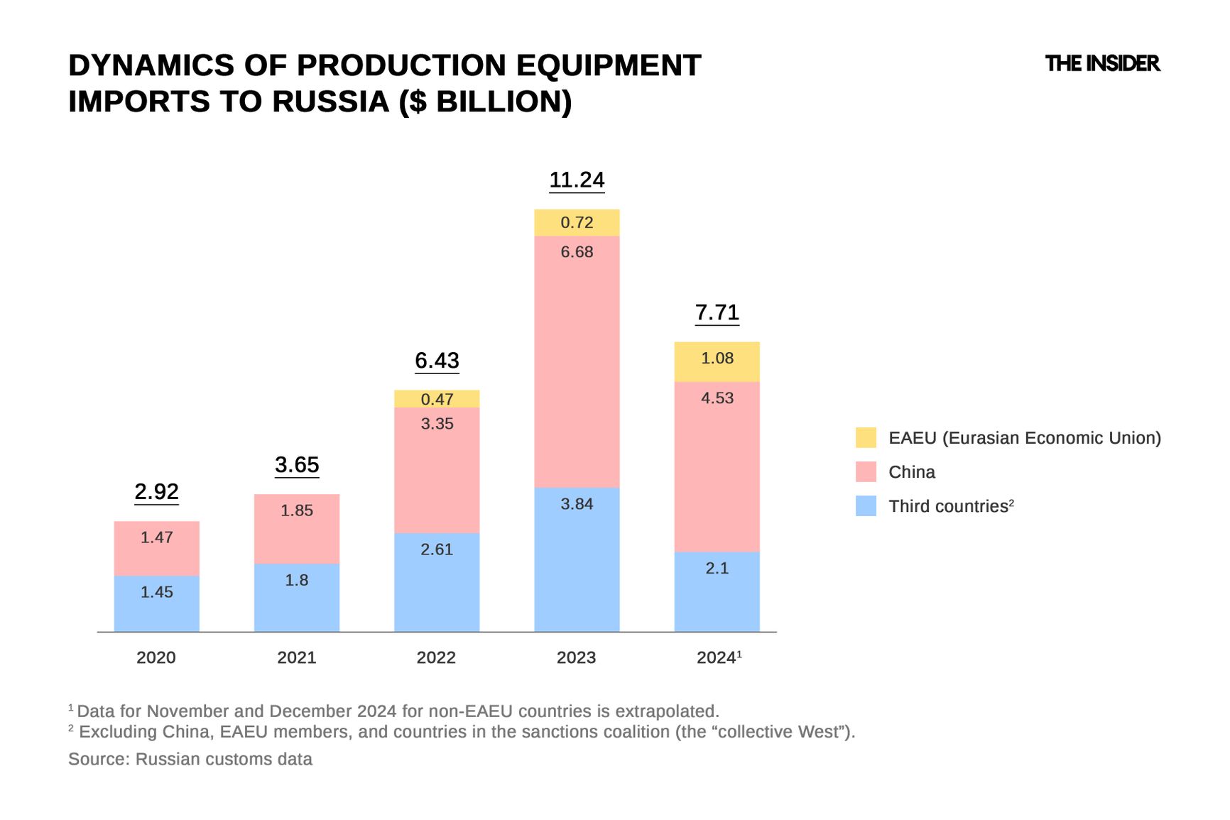 Trade restrictions targeting Western industrial equipment have finally begun to bite. According to Russian customs records, official deliveries from both China and other countries dropped more than tenfold in 2024. Overall, Russia’s imports of industrial equipment fell by roughly 50%.