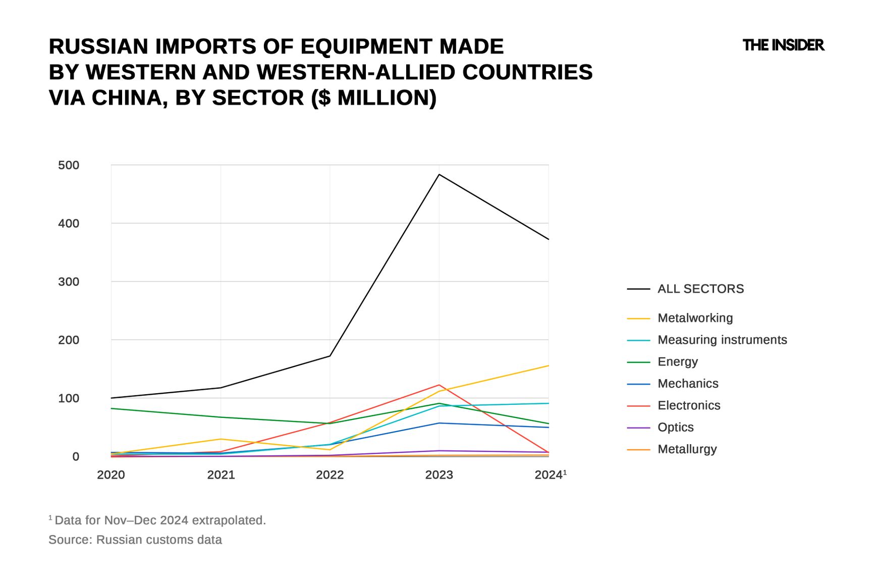 Russia’s full-scale invasion of Ukraine is well into its third year, and finally, international sanctions are having a visible impact on Moscow’s imports of goods with potential military applications. An analysis by The Insider based on customs data shows that in 2024, Russia imported $7.7 billion worth of industrial goods — down from $11 billion the previous year — with some categories, particularly electronics, seeing tenfold declines. Even China, Russia’s main supplier of manufacturing equipment, is scaling back shipments. At the same time, new supply chains have emerged through the most unexpected countries, including Gabon, Haiti, and the Democratic Republic of the Congo. The reasons for the decrease vary: in some cases, Russia may have localized production or begun importing goods without making declarations, but the broader trend shows that a combination of declining funds and increased oversight are weakening Russia’s military-industrial complex.