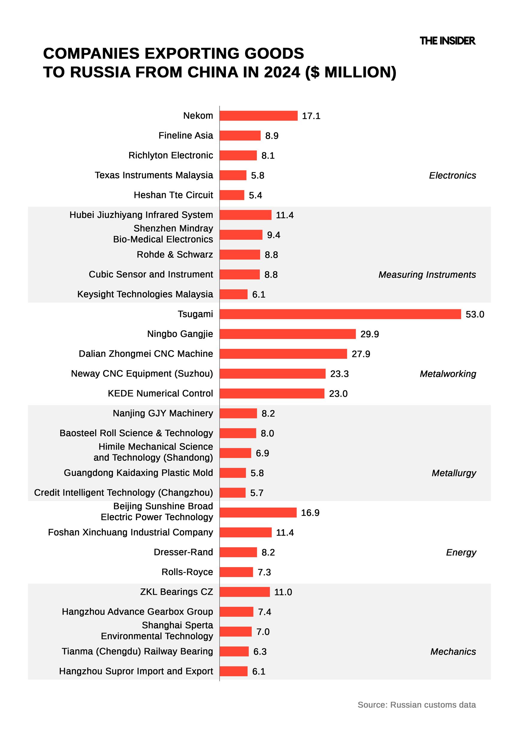 A distinctive feature of the energy sector is the disproportionately large impact of one-off shipments (including of used equipment). In 2024, companies like Dresser-Rand and Rolls-Royce appeared in the top five energy firms supplying Russia — almost entirely due to a major collection of individual shipments, many of them previously reported by The Insider. Notably, Ukraine’s Motor Sich (Zaporizhzhia) made it into the top 20 brands exporting from China to Russia — indicating that shipments intercepted by the Security Service of Ukraine (SBU) in 2022 seemingly continued by inertia into 2024.