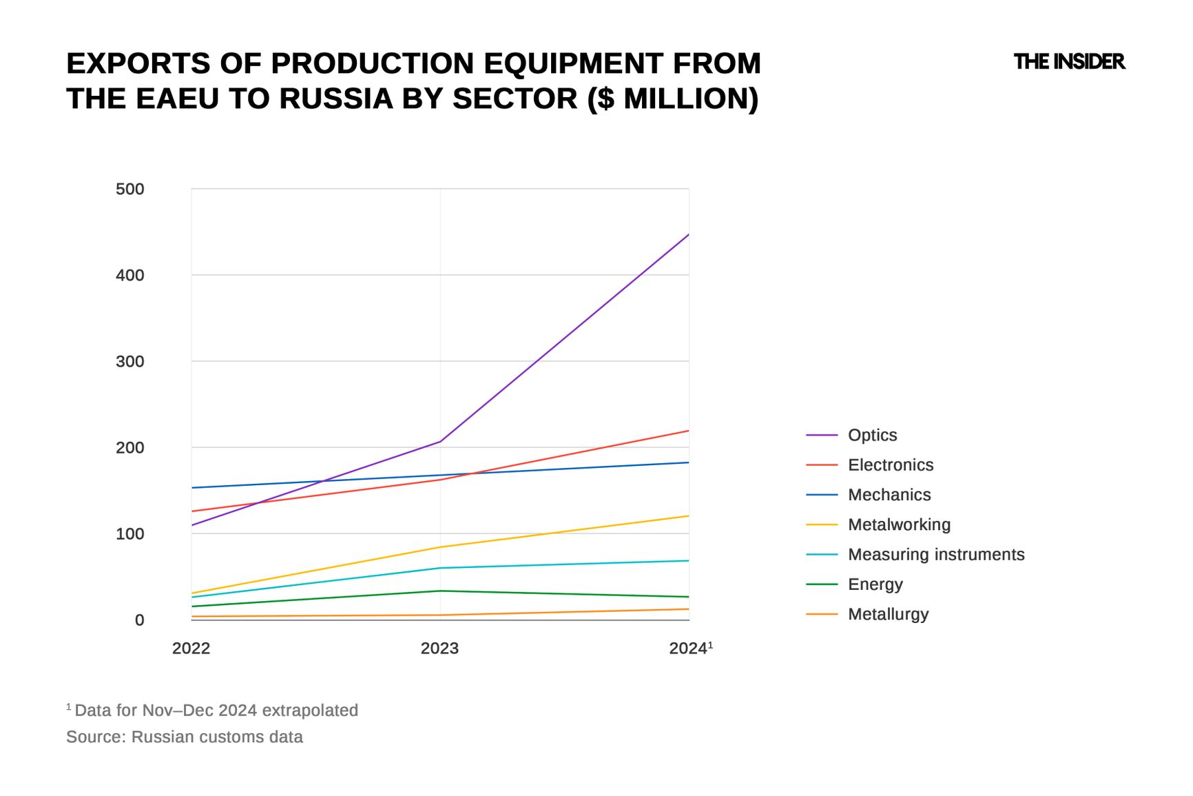EAEU countries posted growth across all sectors except energy in 2024. However, in absolute terms, these figures remain small compared to imports from China and third countries. Optical devices were the only standout: Belarus supplied Russia with over $440 million in optical sight components, including $160 million worth of Sosna-U multi-channel gunner sights used in tanks.