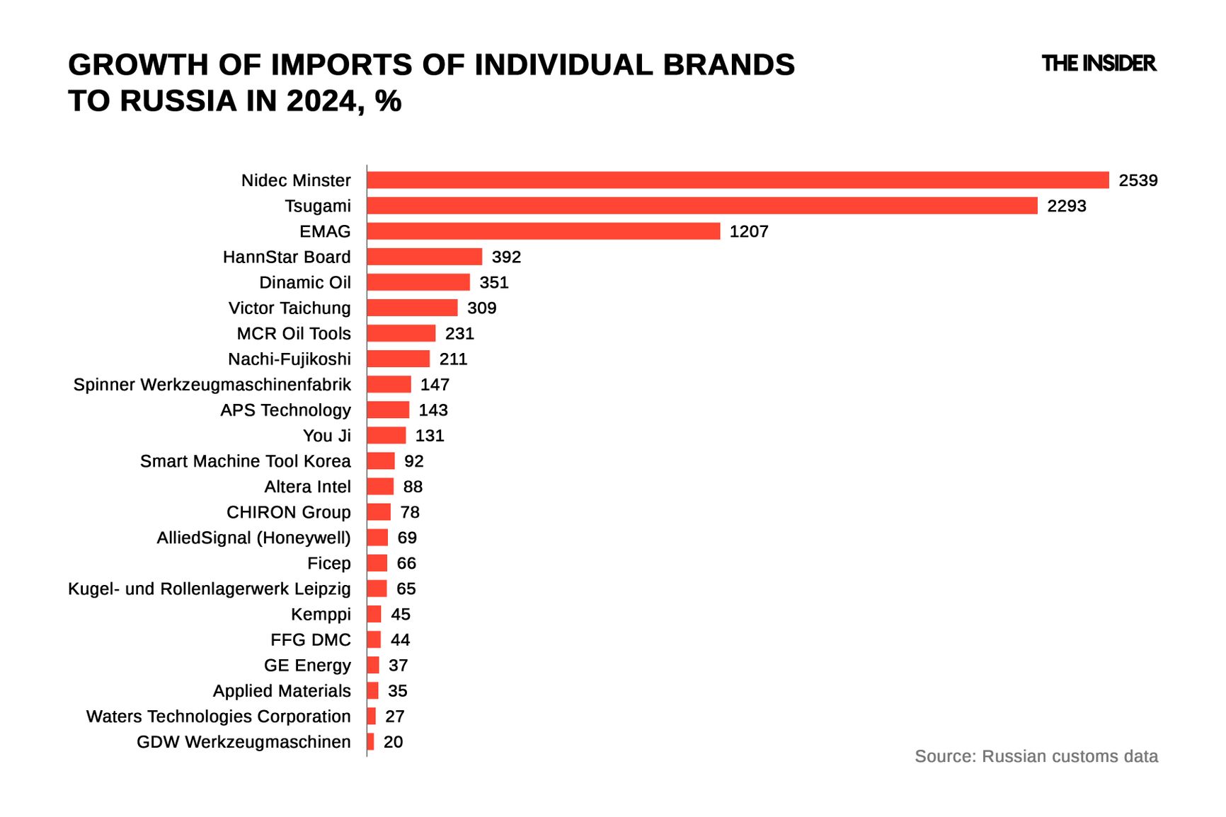 Nevertheless, certain companies from nations labeled by the Kremlin as part of the “collective West” have seen a marked increase in shipments to Russia. Among those with the largest growth in 2024 compared to 2021 was hydraulic press manufacturer Nidec Minster Corporation (U.S.), which saw exports rise 26-fold. The growth among metal-cutting machine manufacturers was slightly less pronounced — the aforementioned Tsugami Corporation (Japan) recorded a 24-fold increase, Germany’s Emag GmbH posted a 13-fold rise, Taiwan’s Victor Taichung Machinery Works grew fourfold, and Spinner Werkzeugmaschinenfabrik, another German firm, saw a 2.5-fold increase.