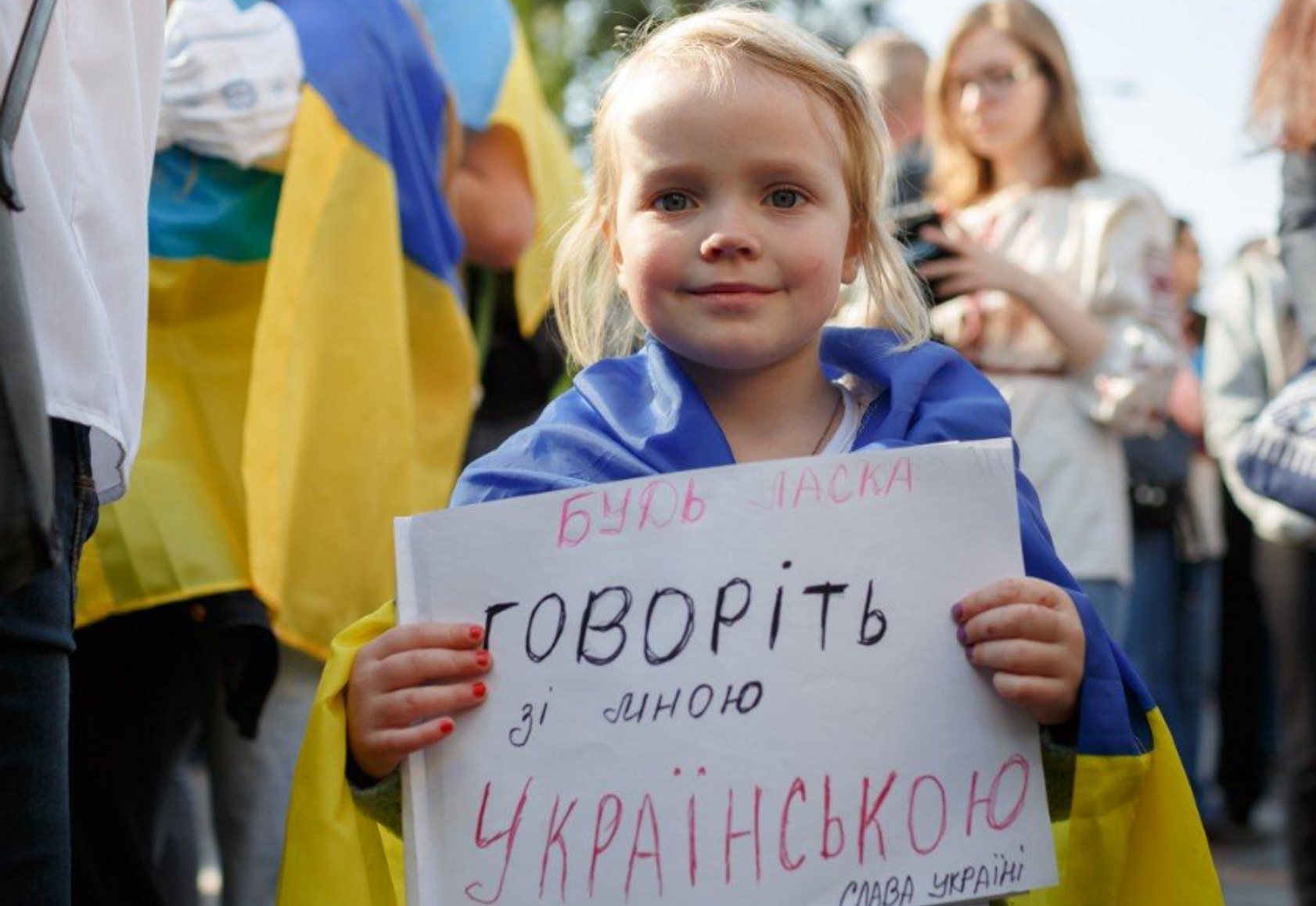 A girl takes part in an April 2019 demonstration in Kyiv in support of the Ukrainian language, holding a sign that reads, “Please, speak to me in Ukrainian.” Source: UNIAN