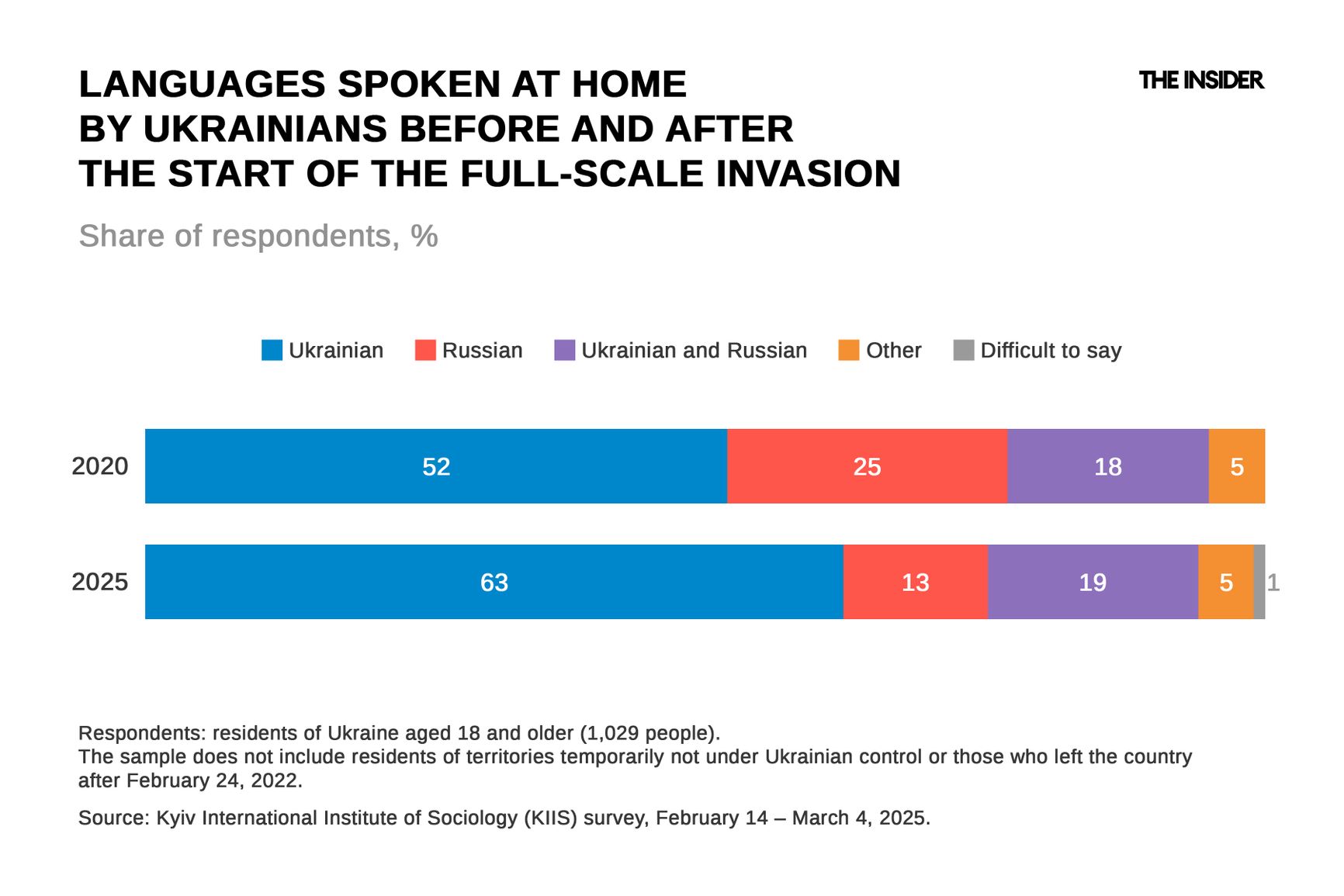 Despite the fact that many Ukrainians continued to speak Russian after the start of the full-scale war, the Ukrainian language became noticeably more prevalent. According to a survey conducted in February 2025, 63% of Ukrainians speak Ukrainian at home (up from 52% in 2020), 13% speak Russian (down from 25% in 2020), and 19% speak both Ukrainian and Russian equally.