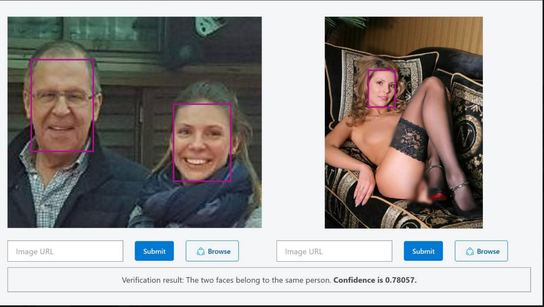 Программа по распознаванию лиц Microsoft Azur, равно как и другие аналогичные программы, подтверждает, что Лобанова и человек на фото с Лавровым и Дерипаской — одна и та же личность: