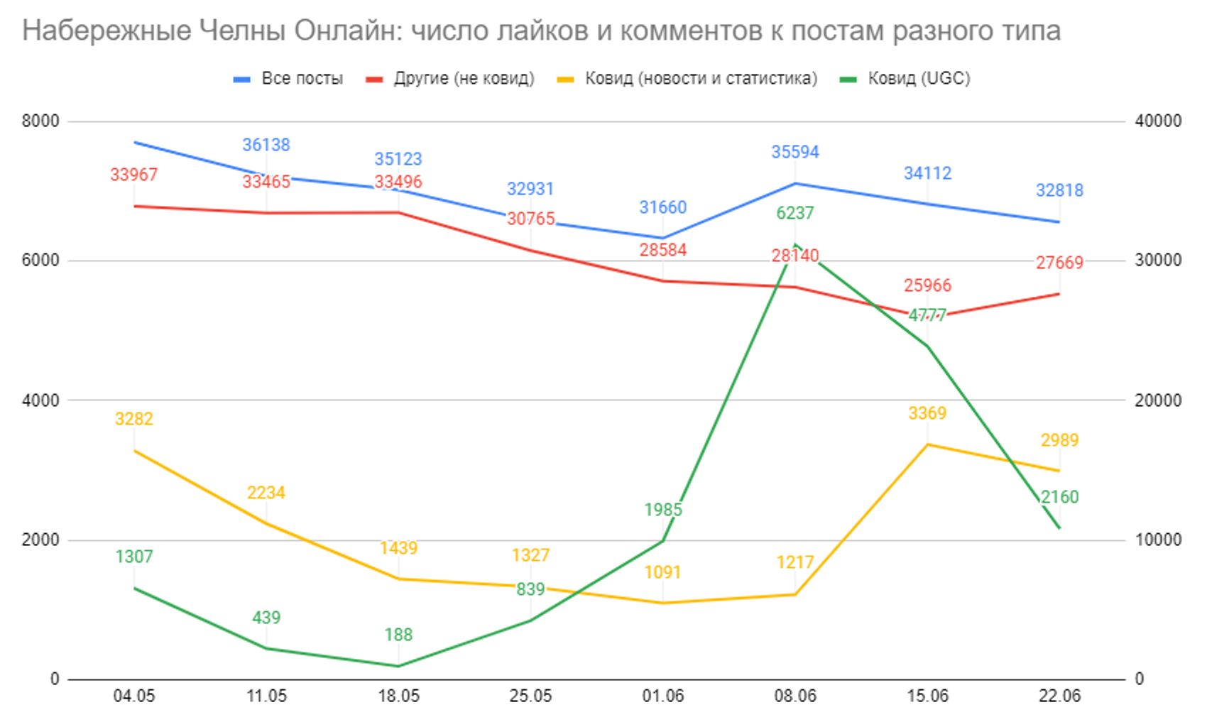 Стремительно растёт вовлечённость людей. В мае подписчики неохотно и неактивно реагируют на «коронавирусные» посты. К концу мая тренд меняется и вовлечённость начинает резко расти. Пик вовлечённости приходится на середину июня (8−22 июня), что совпадает и со статистикой поисковых запросов: