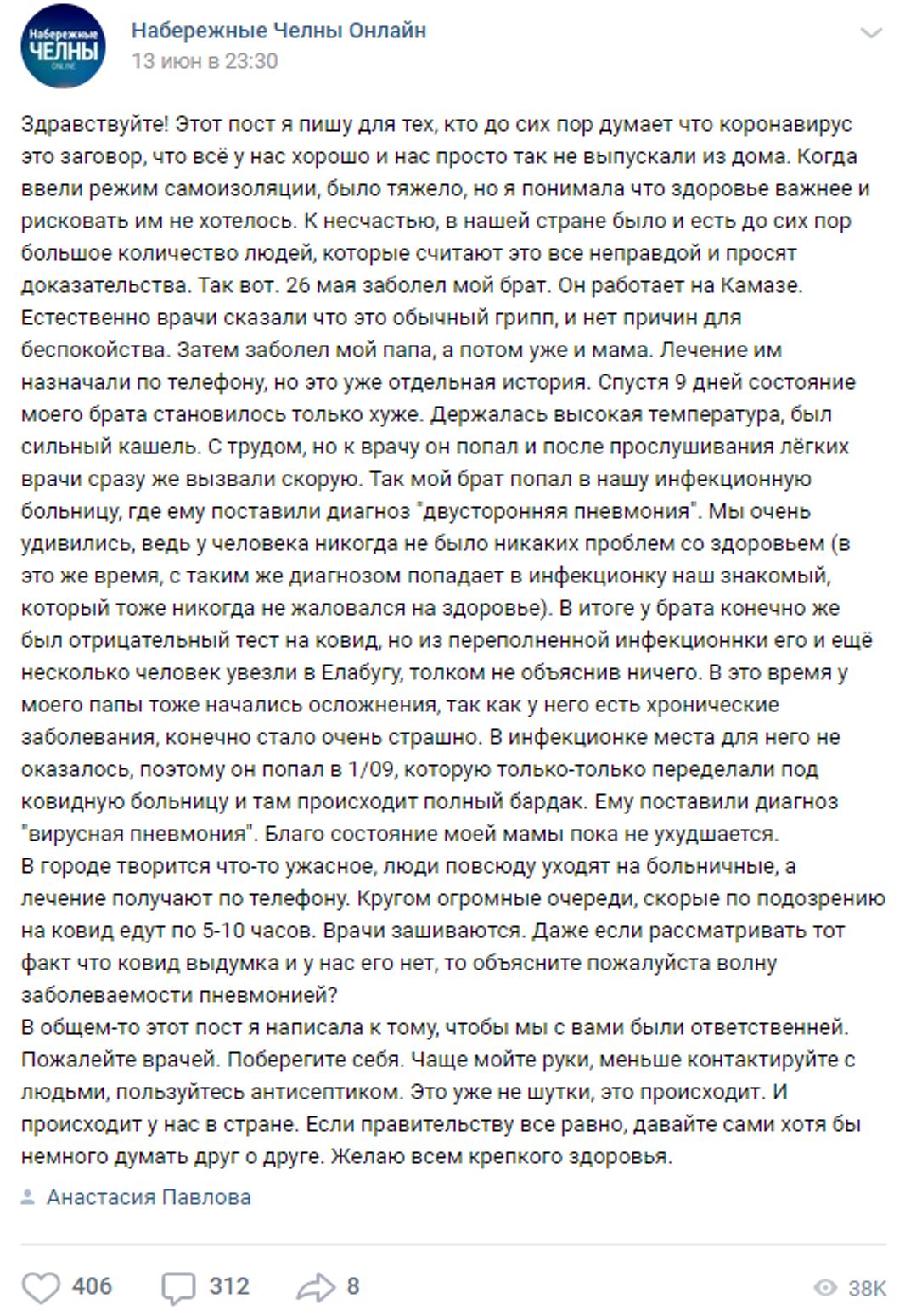 5 июня родители жены из Набережных Челнов (второй по размеру город Татарстана) прислали сообщение: «мы на больничном». У обоих сухой кашель, температура 38, им по 60, но они успокаивают: «нет, это всего лишь ОРЗ», в поликлинике так сказали. В поликлинике Набережных Челнов так говорили всем, выписывая арбидол (противовирусное с недоказанной эффективностью) и антибиотик азитромицин. В Татарстане, как и во многих других регионах России, недооценивали серьезность эпидемии, официально на тот момент Татарстан справился с COVID, а новые случаи ровненько снижались весь последний месяц. В тот момент, когда родители заболели, республика уже перешла к первому этапу снятия ограничений и готовилась ко второму, словно пойдя на поводу у пользователей соцсетей, весной писавших о «барановирусе», «коронаистерии» и «кто-то знает хоть кого-то больного?». Через несколько дней обоим родителям стало так плохо, что при разговоре не хватало дыхания, скорая не приезжала 14 часов, а в больницу с первого раза — уже с подтвержденной пневмонией — их не положили. Со второго раза положили лишь через несколько часов ожидания, причем отцу попытались сначала отказать - несмотря на 60% поражения легких. Им пришлось лежать в переполненной больнице, кому в палате на 6 человек, а кому — в предбаннике.
