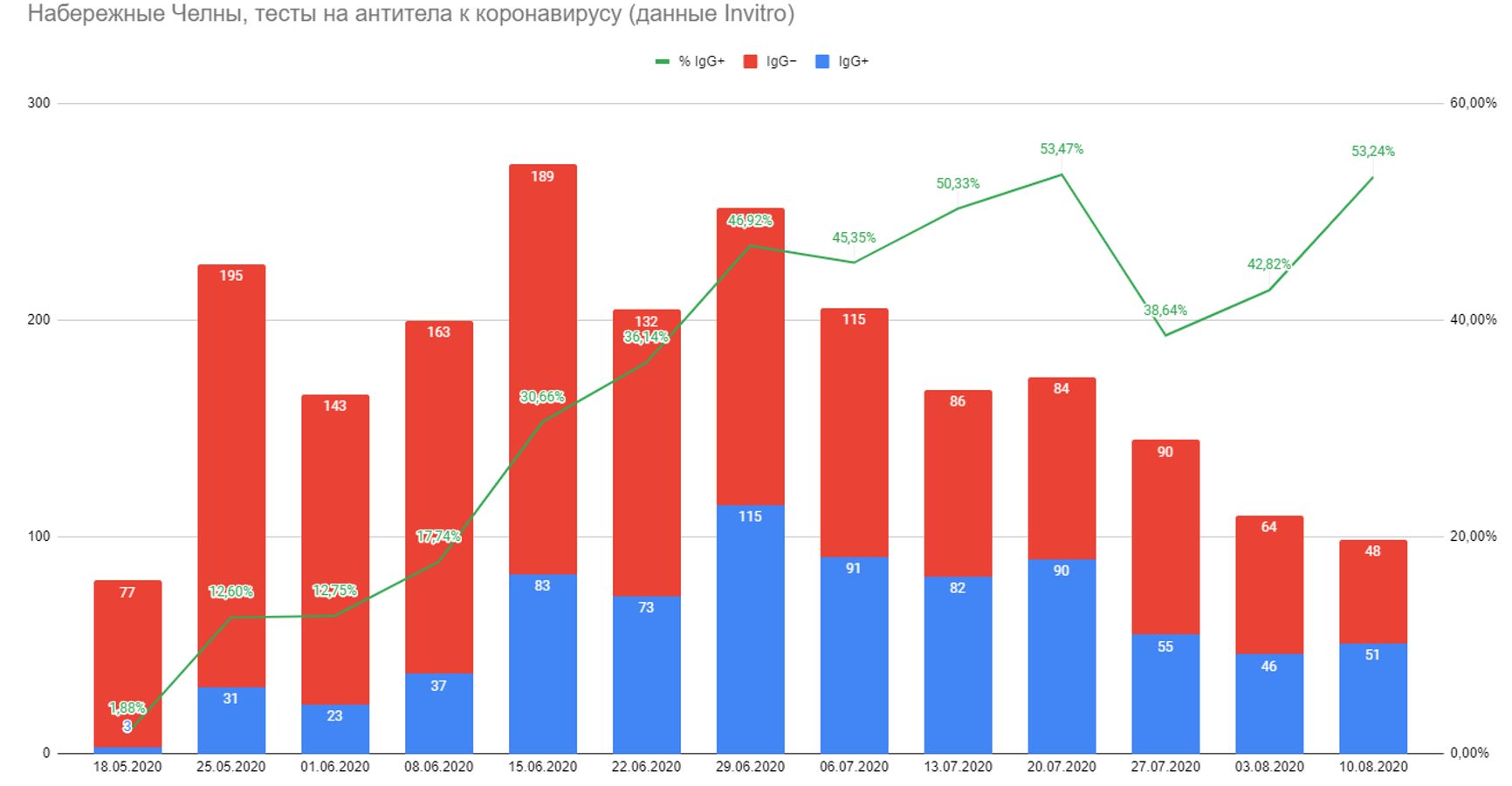 13 июня глава Роспотребнадзора Татарстана заявила, что антитела к коронавирусу есть у 5% татарстанцев, сдавших анализ. На выработку антител IgG+ нужно в среднем от 15+ дней с момента появления симптомов (такова медиана по итогам одного из исследований) — это говорит о том, что на конец мая в Татарстане переболевших было немного. Спустя два месяца, 10 августа, озвучивается уже другая цифра — 31,5%. Даже при вероятно смещённой выборке это говорит о том, что основное распространение эпидемии в Татарстане пришлось на июнь−июль.