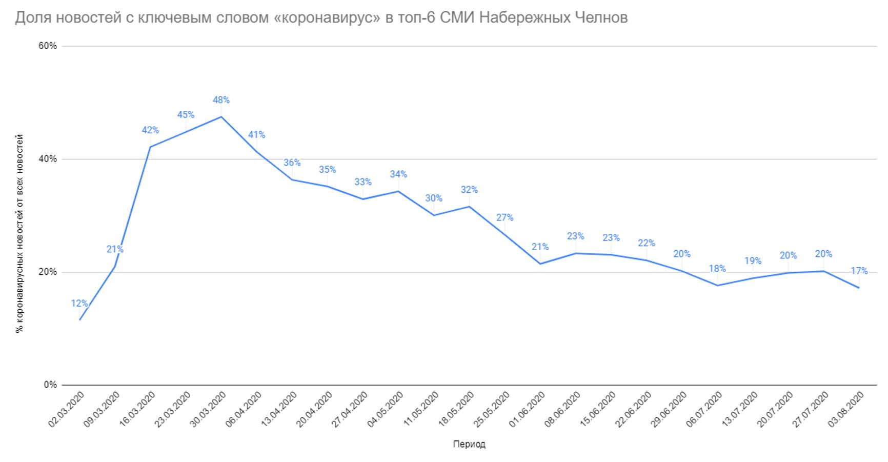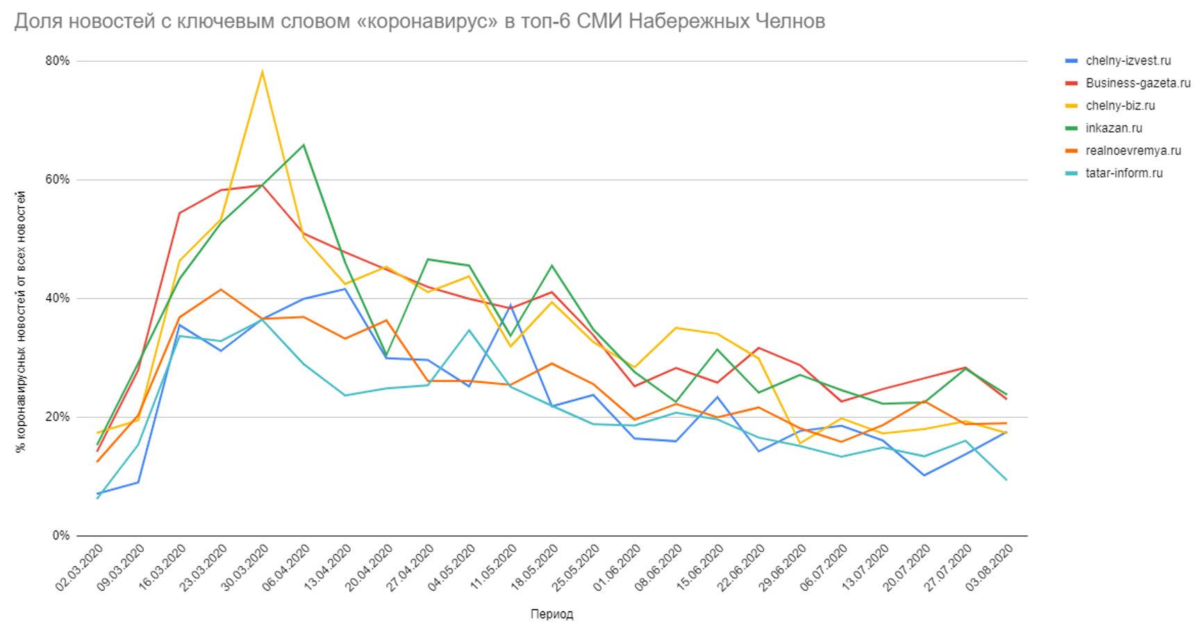 Вторая гипотеза: можно предполагать влияние местных медиа, но анализ татарстанских и челнинских СМИ показывает, что реальный медийный пик интереса приходится на март и апрель, а уже с мая (особенно начиная со второй половины) доля «коронавирусных» материалов падает. Ниже — доля коронавирусных заметок в ключевых татарстанских и челнинских СМИ. Это сводные цифры по топ-5 самых цитируемых СМИ Татарстана (Business-gazeta.ru, Татар-информ, Realnoevremya.ru, Inkazan.ru, Челнинские известия) + одного челнинского СМИ, входящего в топ-9 по цитируемости (Chelny-biz.ru). Источник данных — Яндекс Новости, здесь учитывается количество заметок с ключевым словом «коронавирус» с поиском по сайту конкретного медиа: