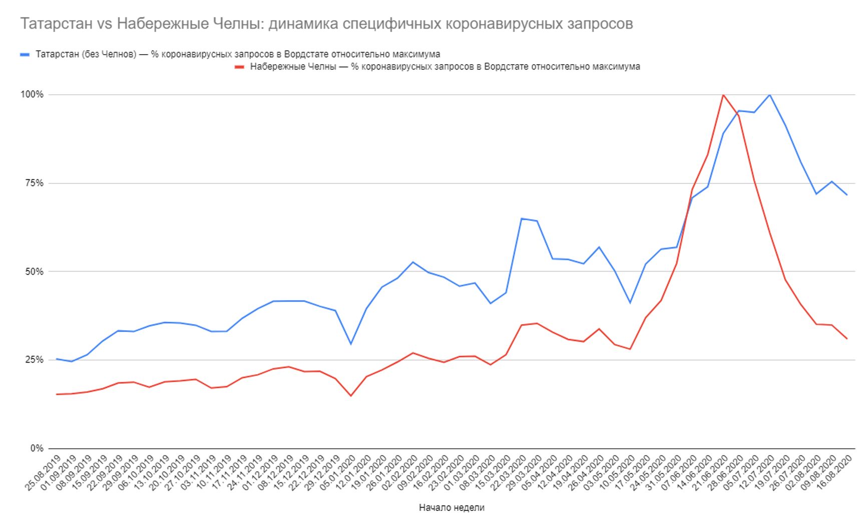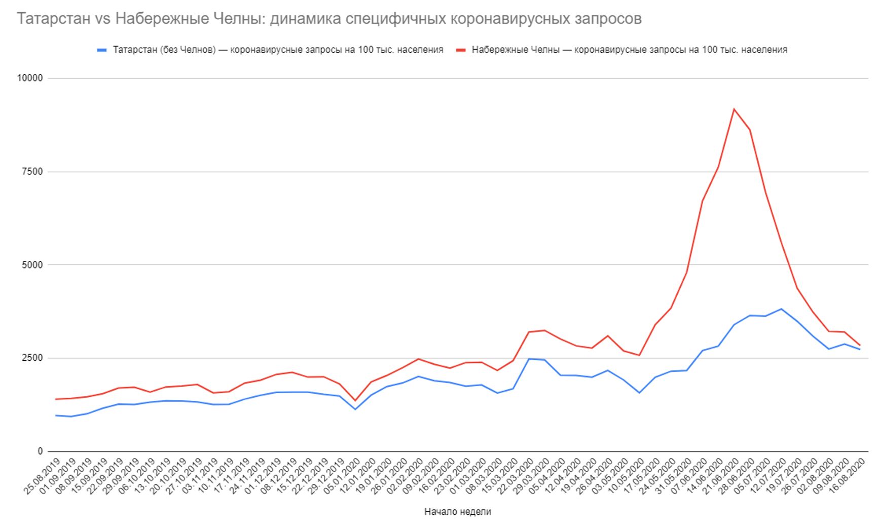 Ещё один аргумент в пользу того, что причина роста запросов по Челнам — не всплеск локального интереса и не влияние медиа — это динамика аналогичных запросов по Татарстану. Если смотреть Татарстан без Челнов, видно, что по остальной республике рост начинается позже — с лагом в две недели относительно Челнов. И если пик по Челнам приходится на середину июня, то по Татарстану — на середину июля: