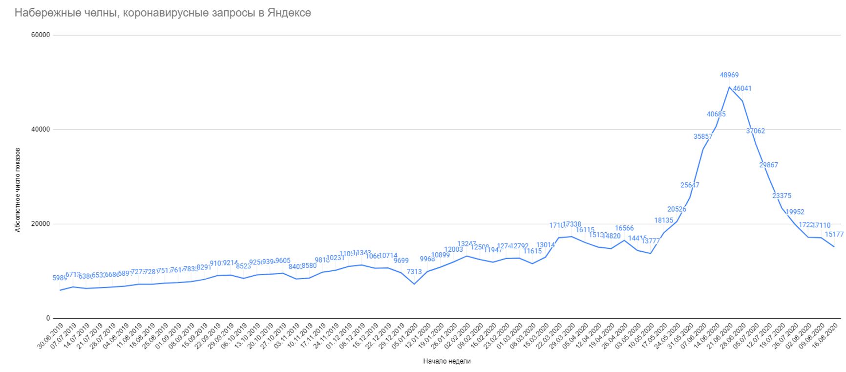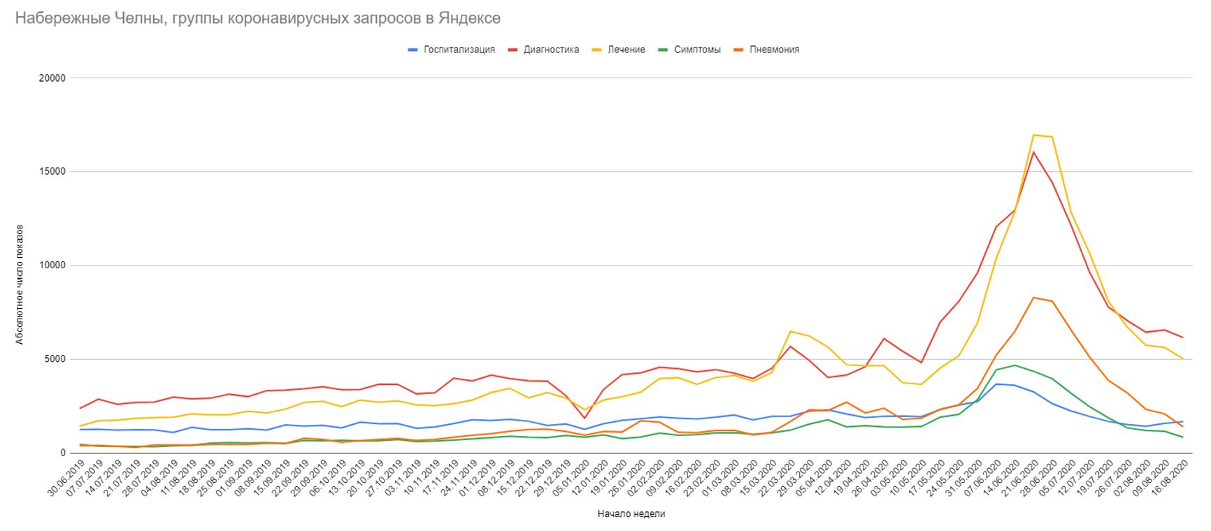 Этот рост можно было бы связать с медийным интересом, но пик в июне дают только наиболее объективные запросы, связанные с течением COVID и, а не запросы общего характера. Также налицо несовпадение с общей динамикой запросов по России — пик здесь был в конце марта (очевидно, медийный), затем ещё один — на рубеже апреля-мая (когда Россия ставила рекорды по новым случаям и вышла на заболеваемость в 10−12 тысяч человек в сутки, а в Москве был пик эпидемии). В середине мая, когда в Челнах начинается рост — по остальной России спад. В середине июня, когда в Челнах пик по запросам — по всей России локальный минимум. См. на графике — красные точки там, где в Челнах происходит экспоненциальный рост показов:
