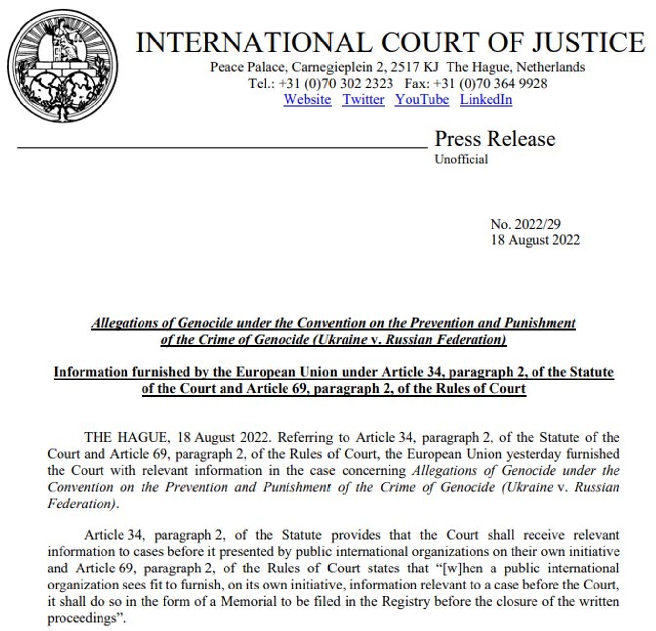 Представительство Украины при ЕС: «Мы благодарны Европейскому Союзу за присоединение к делу в Международном суде ООН Украины против России по обвинениям в геноциде. Справедливость восторжествует».